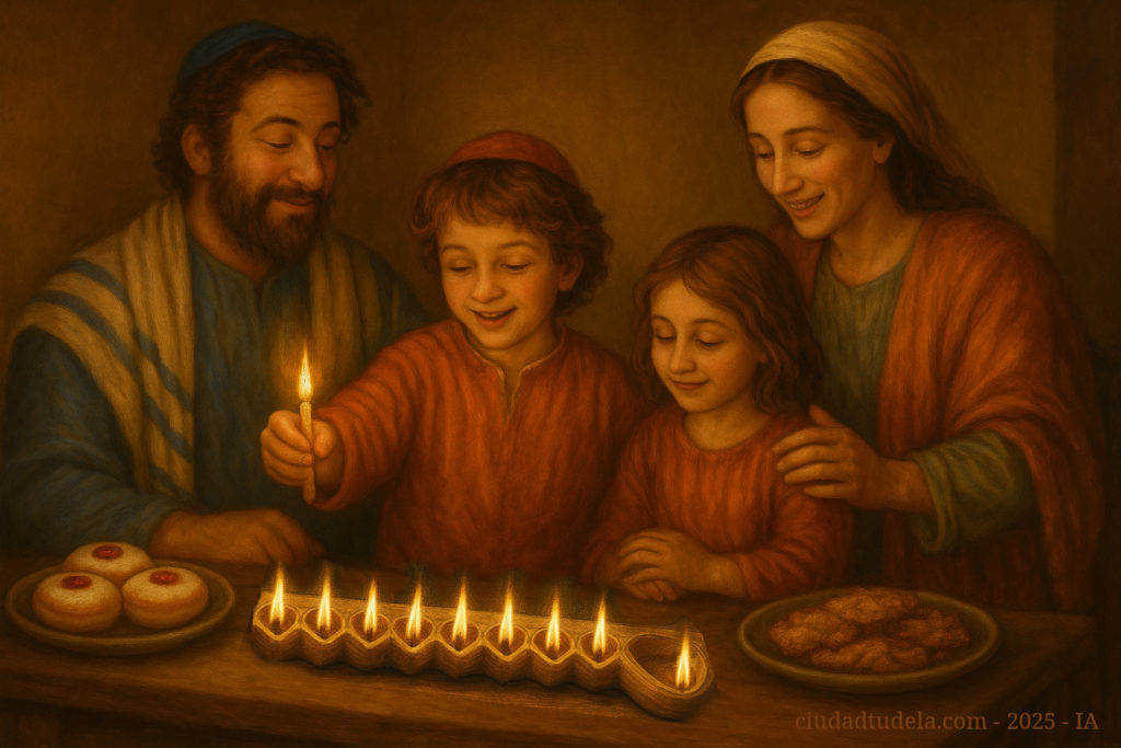 Janucá (חנוכה), que significa “dedicación” en hebreo, se celebra durante ocho días, comenzando el 25 del mes de Kislev (normalmente en diciembre). La fiesta recuerda la victoria de los macabeos contra el dominio helenístico y la reconquista del Templo de Jerusalén, que había sido profanado.