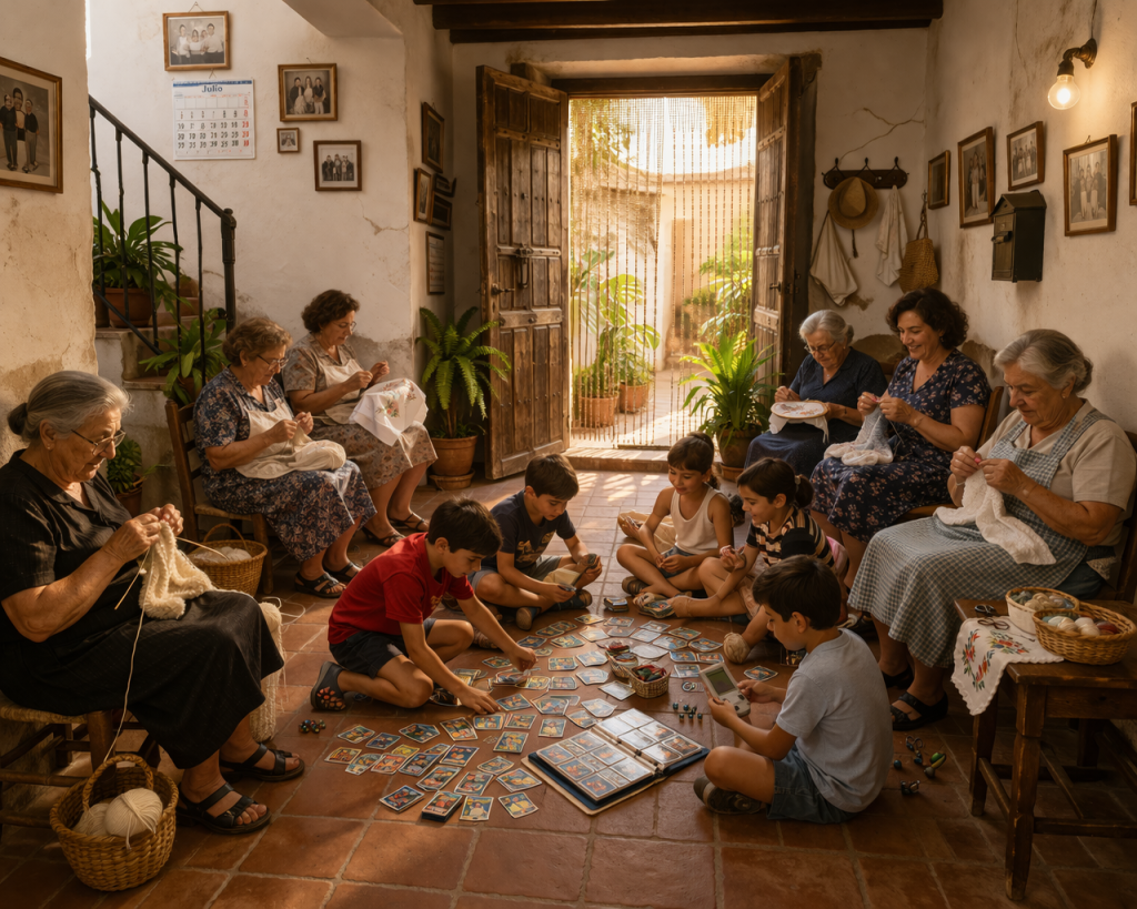 Mientras tanto, los niños íbamos y veníamos. Jugábamos a los cromos en el suelo fresco del portal, dibujando con tiza las líneas del juego o golpeando el montón con la palma de la mano. A ratos escuchábamos las conversaciones de las mayores, aunque muchas cosas no las entendíamos del todo. Pero nos gustaba estar allí, cerca de aquel pequeño mundo que parecía protegernos.